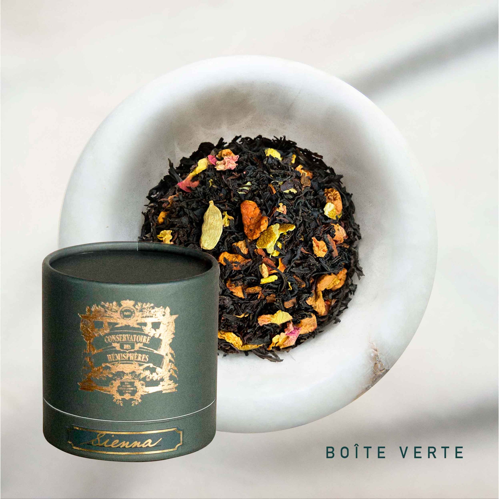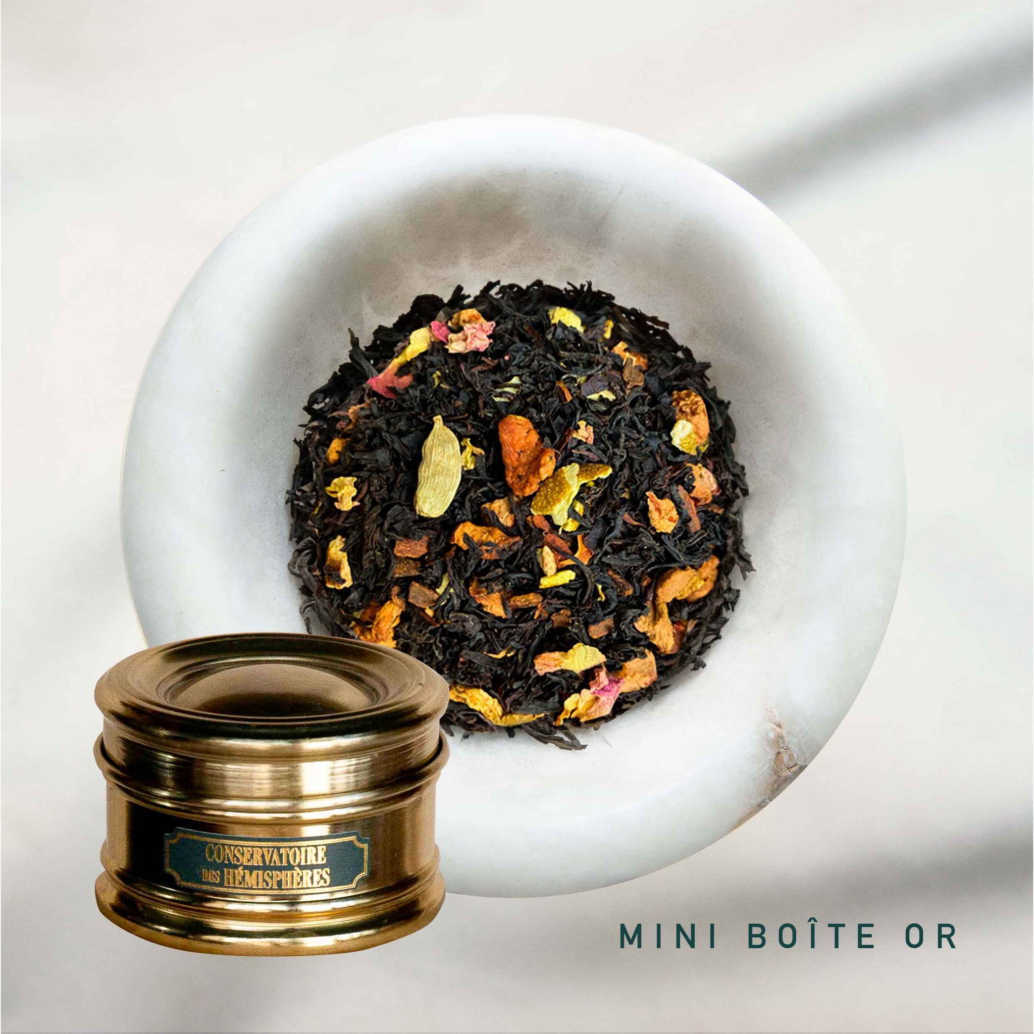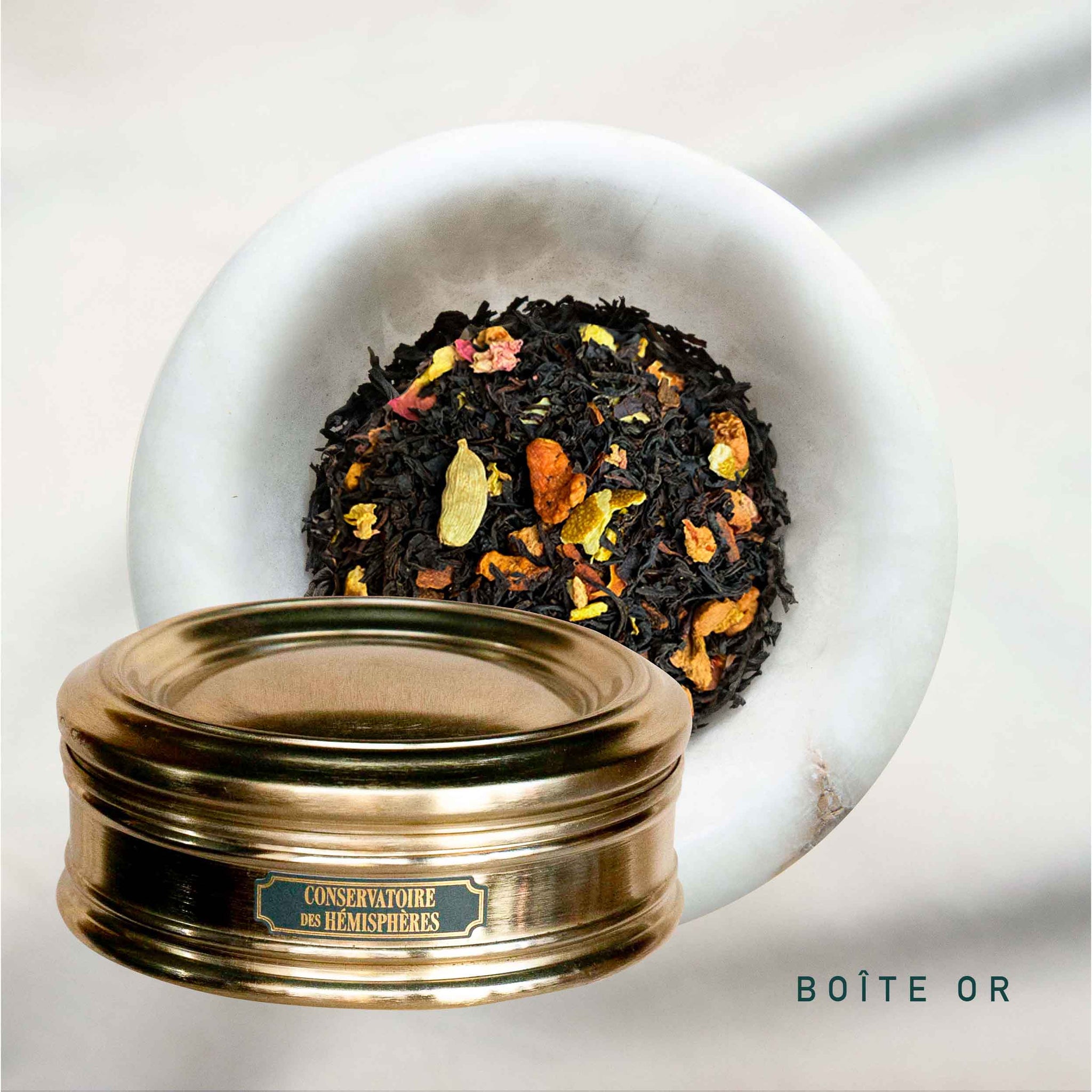 Ce thé noir d'Assam en provenance d'Inde du Sud côtoie quartiers de pommes, écorces d'orange et bâtons de cannelle. Sous la félicité de la cardamome et des pétales de rose.