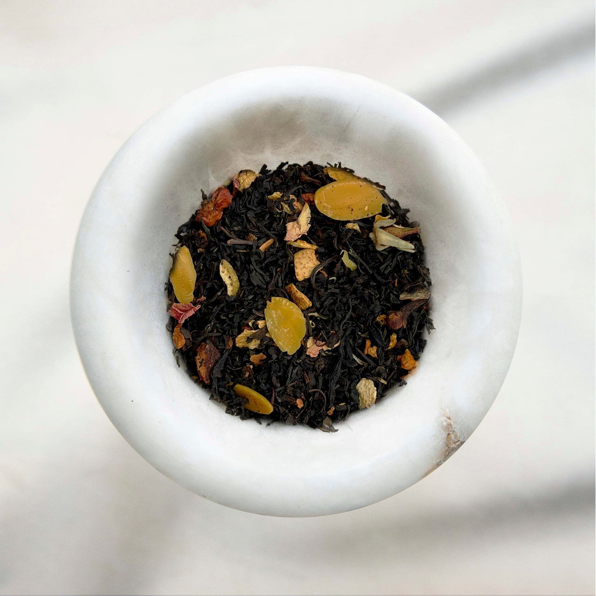 Thé noir Ceylan, Inde du Sud, pomme, écorces d'orange, Amande, pétales de rose, morceaux de cannelle, arôme, clou de girofle, vanille.